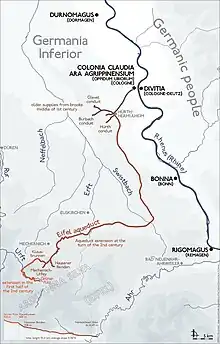 The aqueduct began at a spring in the area of Nettersheim in the Urft river valley. It then travelled along the valley to Kall, where it had to overcome the divide between the Maas and the Rhine. The Roman engineers chose this spot because they were able to overcome the divide without resorting to a tunnel or a pump. The aqueduct then ran parallel to the northern Eifel Mountains, crossing the Erft near Kreuzweingarten (in the Euskirchen district) and the Swistbach with an arched bridge. In Kottenforst, northwest of Bonn, it passed through the Vorgebirge highlands. Finally, it ran through Brühl and Hürth before arriving in Cologne. Other springs in the region that met Roman quality and quantity guidelines were also equipped with aqueducts to feed the main line.