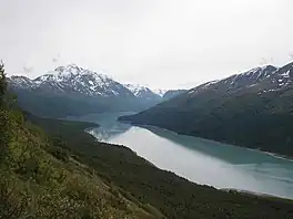 Eklutna Lake (Dena'ina: Idlu Bena) is a 1,424.5 hectares (3,520 acres) lake in the Municipality of Anchorage, Alaska, near the village of Eklutna.[1][2] It is located entirely inside Chugach State Park[3] and is about 1 mile (1.6 km) wide and 7 miles (11 km) in length.[4]