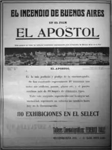 El Apóstol was released on November 9, 1917, at the Cine Select-Suipacha.[3][18][8] The film was successful in Buenos Aires,[19] with many newspapers favorably reviewing the film.[20] The destruction of Buenos Aires near the end of the film was considered its most impressive scene.[21] It was so successful that it was shown several times daily for six months[22] before it was banned by the Buenos Aires town council as a caricature of the current political situation.[9] Because it appealed primarily to Buenos Aires residents, it was not distributed elsewhere in Argentina or abroad. As a result, it was not well-known at the time.[23]