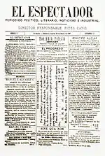 El Espectador (meaning "The Spectator") is a newspaper with national circulation within Colombia, founded by Fidel Cano Gutiérrez on 22 March 1887 in Medellín and published since 1915 in Bogotá. It changed from a daily to a weekly edition in 2001, following a financial crisis, and became a daily again on 11 May 2008,[2][3] a comeback which had been long rumoured,[4][5] in tabloid format (28 x 39.5 cm). From 1997 to 2011 its main shareholder was Julio Mario Santo Domingo.[6]