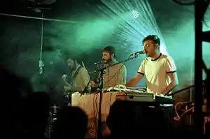 El Guincho (right) performing with his band in Lima, Peru, 2016.