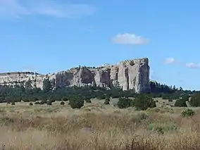 El Morro National Monument is a U.S. national monument in Cibola County, New Mexico, United States. Located on an ancient east–west trail in the western part of the state, the monument preserves the remains of a large prehistoric pueblo atop a great sandstone promontory with a pool of water at its base, which subsequently became a landmark where over the centuries explorers and travelers have left personal inscriptions that survive today.