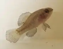 The fish can grow to a maximum length of 3.4 cm (in total length), and it generally grows to 2.3 cm (TL).[2][4] Scales are present at the top of its head.[4][5] Its mouth is both small and oblique.[4][6] The fish does not have a lateral line.[4] A crescent-shaped area behind each eye may be gold or iridescent blue.[4] It has dark lips.[4] Egg count in the ovaries of females in captivity ranged from 115 to 500, increasing with the fish's size.[4]