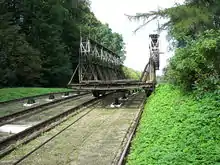 The four original inclined planes are, in order from the summit level downwards, Buczyniec (Buchwalde) with a rise of 20.4 metres (67 ft) and a length of 224.8 metres (738 ft), Kąty (Kanthen) with a rise of 18.83 metres (61.8 ft) and a length of 225.97 metres (741.4 ft), Oleśnica (Schönfeld) with a rise of 21.97 metres (72.1 ft) and a length of 262.63 metres (861.6 ft), and Jelenie (Hirschfeld) with a rise of 21.97 metres (72.1 ft) and a length of 263.63 metres (864.9 ft).[3] The fifth incline is Całuny Nowe (Neu-Kussfeld) with a rise of 13.72 metres (45.0 ft). It was built to replace five wooden locks close to Elbląg.[2][4] They were constructed from 1860 to 1880.