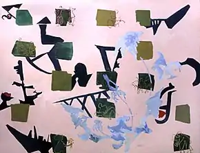 Himmelfarb's painting ranges along a continuum between stylized representation and abstraction that is nonetheless rooted in objective sources, such as the landscape, human figure, and architectural forms.[30][5][19] Critics position her work in the modernist tradition of Picasso, Miró, Matisse and Hans Hofmann in terms of its commitment to formal structure and the play between figure and ground.[6][7][30] Dialogue editor John Brunetti links her to contemporaries such as second-generation Abstract Expressionists Grace Hartigan and George McNeil, noting in their shared use of bold color, painterly surfaces and spatial ambiguity an interest in exploring "the metaphorical potential of the figure and landscape as seen through Modernism's distortions."[5] Himmelfarb has said, "Ideas are the basis of my paintings. Subject matter enters, not as something to be represented, but as an instrument for conveying an idea." She described her expressive tools as the "interplay of opposites—abstraction with representation, organic with geometric, floating forms against those that are static, [and] color that moves around the canvas."[11][31]