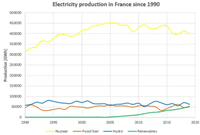 The electricity sector in France is dominated by its nuclear power, which accounted for 71.7% of total production in 2018, while renewables and fossil fuels accounted for 21.3% and 7.1%, respectively[1] (compare to 72.3% nuclear, 17.8% renewables and 8.6% fossil fuels in 2016).[2] France has the largest share of nuclear electricity in the world, and together with renewable energy supplies, this has helped its grid achieve very low carbon intensity.
