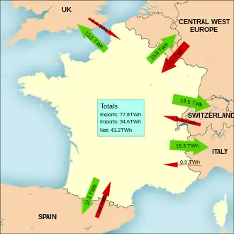 In 2019, France exported a total of 57 TWh of electricity with its neighbouring countries. Since 1990, each year, France roughly exports 10% of its annual production. Its annual exchange sold has always remained positive.[7]