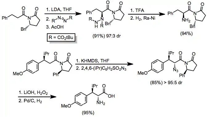 - ↑ Evans, David A.; Britton, Thomas C. (1987). "Electrophilic azide transfer to chiral enolates. A general approach to the asymmetric synthesis of α-amino acids". J. Am. Chem. Soc. 109 (22): 6881–3. doi:10.1021/ja00256a069.