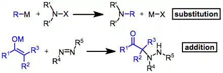 Electrophilic amination reactions can be classified as either additions or substitutions. Although the resulting product is not always an amine, these reactions are unified by the formation of a carbon–nitrogen bond and the use of an electrophilic aminating agent. A wide variety of electrophiles have been used; for substitutions, these are most commonly amines substituted with electron-withdrawing groups: chloramines, hydroxylamines, hydrazines, and oxaziridines, for instance. Addition reactions have employed imines, oximes, azides, azo compounds, and others.