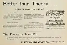 The instruments were widely advertised in popular magazines[4] and the company, Electrolibration, opened numerous offices far from their headquarters in Birmingham, Alabama including New York and London. The President of Electropoise, John N. Webb, admitting that he was not a man of science stated that his hands were full handling the business.[5] It was sold for about twenty-five dollars. Other successors like Oxydonor were sold at ten to thirty dollars.[6] Even during its heyday, a period when electricity was viewed with awe, some physicians called attention to the nature of the fraud but their efforts had little impact on the advertisement and sale. A letter to the editor of the Journal of the American Medical Association in 1897 by a physician named George N. Kreider states that "One of the most glaring frauds of this decade has been an appliance known as 'Electropoise,' advertised in Harper's Monthly and other leading publications" and promoted by a W.H.De Puy, editor of the New York Christian Advocate.[7][8]