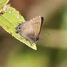 - 1 2 Nishida, Kenji; Robbins, Robert K. (11 November 2020). "One side makes you taller: a mushroom–eating butterfly caterpillar (Lycaenidae) in Costa Rica". Neotropical Biology and Conservation. 15 (4): 463–470. doi:10.3897/neotropical.15.e57998. eISSN 2236-3777.