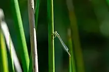| Aurora Bluetail damselfly perched on tall spikerush. | |