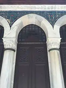 There is an arch-like wall between the ground floor and the dome which relieves the weight of the dome, also holds the dome together in an architectural and aesthetic way. Most of the building is concrete and painted to greenish yellow. The dome is green. The windows and the doors are made out of wood. The frames of the windows and doors, and the columns are made out of marble. Also the ceramic glazes are blue and because of that they have a harmony with the walls.