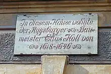 Elias Holl was born in Augsburg, Werbhausgasse 2. He was descended from a master-builder-Family. His father Hans Holl (1512-1594) taught him. In 1596 he passed the exam, the Meisterprüfung. After an abidance in Tyrol and Italy in the years 1600/1601 – he visited Bozen and Venice – in 1602 he became Werkmeister of Augsburg. In 1629 he lost his office as Stadtbaumeister because he was a protestant. Since then he was only called Stadtgeometer. He was dismissed from office in 1631. He is buried in the Augsburg Protestant Cemetery.[1]