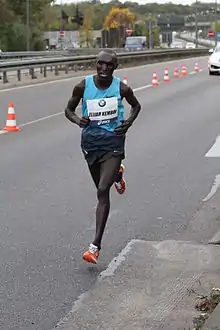 Elijah Kiprono Kemboi (born 1984) is a Kenyan long-distance runner who competes in marathon races. He has won marathons in Košice and Antwerp. His personal best for the event is 2:07:34 hours. He competed in Kenyan road races in his early twenties, and the Nairobi Marathon was his first experience of the distance (14th in 2008 and 21st in 2009).[1] It was not until 2011 that he started racing at the top level in European marathons. That year saw him win the Antwerp Marathon in a course record time of 2:11:15 hours.[2] He matched that time to win the Košice Peace Marathon in October.[3] The following year he was tenth at the Barcelona Marathon (2:12:15),[4] but was much improved on his return to Košice: although he failed to defend his title and ended the race in fourth, he set a new lifetime best of 2:07:51 hours for the distance.[5]