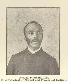 Elijah P. Marrs was born a slave in January 1840 in Shelby County, Kentucky to Andrews and Frances Marrs. His father, Andrew, had been granted his freedom by his master before Elijah was born, but his mother was still a slave,[1] and with her sons was owned by a man named Jesse Robinson.[2] His parents were born in Culpeper County, Virginia.[3] He had one brother, Henry C. Marrs. He converted to the Baptist religion at the age of eleven by Rev. Charles Wells[1] and received basic education studying at night under Ham Graves, a black man, and later at Sunday schools.[4] Marrs picked up on Graves' ability to teach and began teaching fellow slaves how to read as well.[5] This passion for teaching and helping others continued even when the American Civil War (1861–1865) started, Marrs read newspapers to other slaves, keeping people informed about the wars progress.[6]