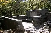 The Eliot Memorial Bridge is a footbridge which was built in 1904 in memory of Charles Eliot, landscape architect to the Metropolitan Park Commission. It is located on the Skyline Trail near the summit of Great Blue Hill in the Blue Hills Reservation, south of Boston, Massachusetts. Eliot was a driving force in the establishment of many of the Greater Boston area's early parks, including the Blue Hill Reservation. The bridge was built out of locally quarried granite, and completed c. 1905–06. Built into its structure are a bench and commemorative plaque.[2] The bridge, which crosses a small ravine, is a remarkably large and sturdy structure for the location. The bridge is in neighborhood to the Great Blue Hill Observation Tower, near the 635-foot (194 m) summit of Great Blue Hill, a few hundred yards from and a little below the Great Blue Hill Weather Observatory, which is at the top of the mountain. The view from the observation tower toward the Observatory and its forest of radio, TV, and microwave antennas, is obscured by trees.