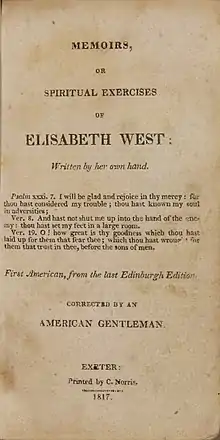 Her memoirs were published in 1766[1] (and 1798) as the Memoirs, or, Spiritual exercises of Elisabeth West, etc[4] The memoirs were popular among the religious enthusiasm of the Cambuslang Work.[1] Elisabeth West's memoirs were first published in the US in 1817 by subscription.[5]