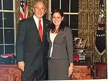 After graduating from Harvard, she joined the George W. Bush administration,[15] as a staff member for the U.S. Domestic Policy Council.[16] Stefanik later worked in the office of Joshua Bolten, the White House Chief of Staff.[16] In 2009, she founded the blog American Maggie, a platform to promote the views of "conservative and Republican women", named after British Prime Minister Margaret Thatcher.[13]