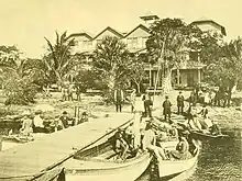 As land values in the Lake Worth region began increasing in the early 1890s, locals saw the need for the construction of a bank.[10] Dimick, along with Edmund M. (who owned the Brelsford House) and John H. Brelsford,[11] opened the area's first bank in May 1893,[10] with the building housing it constructed earlier that year in Jupiter.[12] Dimick served as the bank's first president, then located in Palm Beach just south of Royal Poinciana Way. Around that time, construction was underway on the nearby Royal Poinciana Hotel, which opened in February 1894. Consequently, Henry Flagler paid his workers via the Dade County State Bank. Despite the Panic of 1893, deposits in the bank collectively increased to about $50,000 in the summer of 1893, which bank cashier George L. Branning described as a "handsome sum". The building remained in Palm Beach until 1897,[10] when a barge transported the bank across the Intracoastal Waterway to West Palm Beach at the intersection of Clematis Street and Olive Avenue.[11]