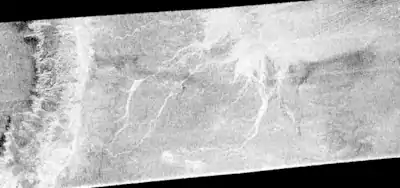 - ↑ "Fig. 1. Cassini RADAR image of Menrva and Elivagar Flumina taken during the T3 fly-by, showing the channels near Menrva and the catchment basin (highlighted in blue)". Retrieved 18 June 2016.