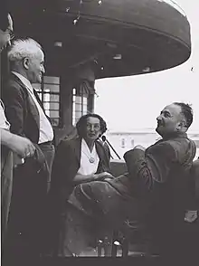 Eliyahu Dobkin (seated right) and his wife speaking with David Ben-Gurion (2nd from left) at Lod Airport before their flight to New York, May 1947.
