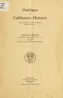 This article incorporates text from this source, which is in the public domain. - ↑ "Obituary for Eliza D. Keith". The San Francisco Examiner er. 9 November 1939. p. 17. Retrieved 27 August 2022 – via Newspapers.com.