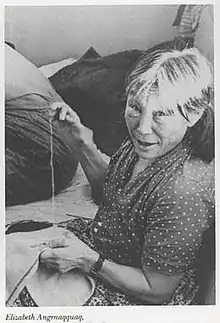 Elizabeth Angrnaqquaq (1916–2003) was an innovative Canadian Inuk textile artist active from the 1970s to early 2000s. Angnaqquaq's work explores textile creations while experimenting with non-traditional methods. Her style has been described as painterly for the way in which she fills the space between her figures and animals with embroidery.[1]