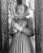 Sculpted figure of Elizabeth de Vere on the double tomb monument to her grandmother Mildred Cooke, Baroness Burghley and to her mother Anne de Vere (née Cecil), Countess of Oxford in Westminster Abbey.
