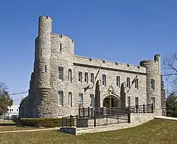 Elkton Armory is a historic National Guard armory located at Elkton, Cecil County, Maryland. It was constructed in 1915 and is a two-story brick structure with full basement faced with light gray granite, with a narrower one-story drill hall attached. Its design imitates a castle, with corner towers flanking two-story curtain walls with irregular window placement. The front facade features a projecting center gate, flanked by buttresses, with a carved relief of the State Seal of Maryland above the entry.[2]