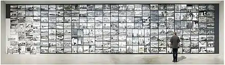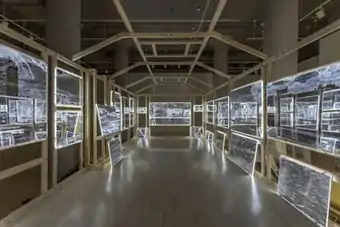 Arcade/Arcadia (2011–7) was commissioned for the opening of Turner Contemporary in Margate. It examined the sublime, ephemerality and loss, juxtaposing the seaside town's one-time idyllic status as a resort and haven for J. M. W. Turner and its contemporary socioeconomic decline.[71][72][73][74] Harvey built a skeletal version of Turner's London gallery, hung with 34 rear-illuminated, hand-engraved mirrors mimicking the exhibition at the time of his death, which depicted a panoramic view of the shabbier, contemporary Margate.[17][71][75][74] Reviewers described it as "witty and poignant,"[17] and "a combination of funhouse and haunted house … more spiritual than secular."[65] Harvey's later project, The Disappointed Tourist (2019– ), revisited these themes through a painted archive of sites that no longer exist—from amusement parks to classical monuments to themed restaurants remembered from childhood—that respondents submitted online as places they wished they could once again visit.[76][77] The project's installation at Turner Contemporary (2021) consisted of over 220 paintings hung in an enormous grid and placed in dialogue with works by Turner (sketches of Roman ruins and coastal views of Margate). Frieze described its effect as "something quite mournful, like a wall of faces of missing people after a disaster."[76][78] The project's installation at Museum der Moderne Salzburg (2021) was described as an attempt to "localize existential memories," mapping a spectrum that ranged from traumatic experiences (war, racism, and ecological disaster) to more mundane losses caused by technological change or gentrification.[77]