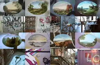 Harvey's early work examined art production conventions and the public desire for representational art.[36][37][38] She gained wide attention with her "New York Beautification Project" (1999–2001),[39][40] which comprised 40 small, oval oil landscapes, illegally painted over graffiti-covered sites throughout New York City.[41][37][42][29] Choosing what she called "anodyne images," she sought to investigate the criteria behind value judgments about art, including what is popular or offensive, and how an artist's demographic relates to privilege.[43][44][45][27] In reviews, The New York Times described these works as "hit-and-run pastoral scenes"[43] that were painted with "the tenderness, glowing light and overlapping greens of the Hudson River School"[37] and "turn[ed] street art on its head."[41]