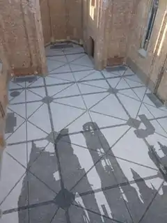 Harvey frequently draws on the Romantic tradition's idealization of ruins and fragments, reframing cycles of cultural production in order to explore fallacies and failures involving representation, communication, permanence, and ideology.[61][1][62][12][63] For the public art commission Repeat (2013, Bossuit Belgium), she "de-restored" a desanctified, post-WWI village church that had fallen into disrepair and disuse, removing the roof, interior pillars, and ritual furnishings and transforming it into a multi-use public square-artificial ruin; a new terrazzo floor incorporated schematic traces of the removed elements and a grey pattern evoking the shadows of the previous, ruined church after its bombardment.[64][65][66][12]