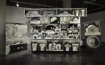 Harvey's absurdist exhibition, The Alien's Guide to the Ruins of Washington, D.C. (2013, Corcoran Gallery), invoked a future earth excavated by aliens left to piece together the lost culture by only its architecture.[11][67][68] Based on the classical and neo-classical ruins they find worldwide—on display in The Pillar-Builder Archive (2013), a room of 4,000 alien-classified postcards of such structures—they wildly misinterpret humanity as an egalitarian, three-sexed, aquatic species unified by the building of pillars.[11][67][69] Frieze's George Pendle described the show—which included a hand-painted, life-size Alien Souvenir Stand, a tour guide to actual DC sites, and a pillar-influenced alien space ship—as a "less bleakly dystopian than happily deranged" examination of the ubiquity of the classical in worldwide vocabularies of power and constructions of cultural memory.[11][67][70]