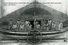 The wind, tide and sea made it impossible for the Liverpool lifeboat to link up with the waiting tug for another tow, so the men were forced to start rowing home. About twenty minutes later, as the boat reached the relatively safer waters of the channel, the master elected to raise the foresail to help steady the vessel.[23] People in the lifeboat were still congratulating themselves on their lucky escape, when Captain Martin noticed a huge wave "like a high wall" approaching.[23] He instructed everyone to hold on, fearing that someone might be washed overboard. However rather than breaking over the boat, the wave lifted it and flipped it over.[23][24][16] The boat was not self-righting, so the remaining survivors were left clinging desperately to the upturned boat. Rattler's master witnessed the incident and signalled to the New Brighton lifeboat, Willie and Arthur, which promptly turned around to come to the rescue.[25][23] The men who were on the capsized boat directed the New Brighton lifeboat to first assist three others who were in more danger clinging to bits of wood in the sea.[23] After picking up the survivors and one casualty, the New Brighton lifeboat was taken in tow by Rattler, which brought her back to New Brighton. Six of Ellen Southard's crew, the captain and his wife, as well as the pilot and three lifeboat men from Mersey Docks drowned or died of exposure (12 fatalities in total).[24]