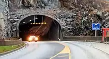 The Ellingsøy Tunnel (Norwegian: Ellingsøytunnelen) is a subsea road tunnel in Ålesund Municipality in Møre og Romsdal county, Norway. The tunnel runs between the center of the city of Ålesund on the island of Nørvøya and the village of Hoffland on the island of Ellingsøya. The 3,481-metre (11,421 ft) long tunnel runs under the Ellingsøyfjorden. It is part of National Road 658 and was constructed as part of the Vigra Fixed Link project, which connected several outlying islands to the city of Ålesund and the mainland of Norway.[1] The tunnel opened in 1987 and it was a toll road until 25 October 2009. The three-lane tunnel has a vertical clearance of 4.6 metres (15 ft) and it reaches a depth of 140 metres (460 ft) below sea level. The steepest parts of the tunnel do not exceed an 8.5% grade. [2][3] The Ellingsøy Tunnel has a corkscrew spiral under the Hoffland island to span vertical height.