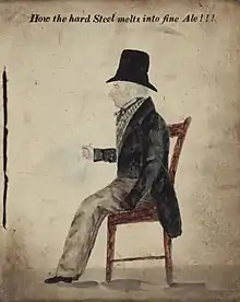 The art historian Paul Joyner points out the 'consistent innovations' found in Ellis' drawing. He describes the Life and Times of Richard Robert Jones as 'a Welsh Odyssey'[9] and points out his use of a classical, 'Flaxmanesque, style of outline drawing'.[10] Arguably, Ellis' style recalls John Flaxman's illustrations to Homer as well as Sandro Botticelli's illustrations of Dante's Divine Comedy. Such a range of references leads to an unexpected synthesis in Ellis' work between rustic Welsh subject matter and classical erudition, obviously the product of a good arts education despite the artist's humble background. The tone of this work, like many cartoons and drawings by Ellis, is rather difficult to pin-point. It is light and satirical rather than serious, and potentially contains layers of in-jokes between the artist and his subject. Ellis also began work on a number of blocks to illustrate a picaresque fiction in pamphlet form about the highway man Dick Turpin published by John Jones.[11]