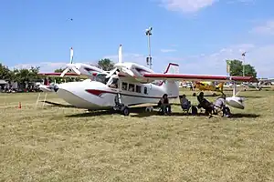 The Gweduck is a re-engined "re-creation" in modern composite materials of the early 1940s Grumman G-44 Widgeon. The name can also be written Geoduck and is not named for a bird, but a large clam. Although it is broadly similar to the Widgeon and follows its cantilever high-wing monoplane, twin engined, cruciform tail and tailwheel undercarriage layout, it has more powerful engines, retractable floats, more cabin windows and is larger all around.[1][2][3]
