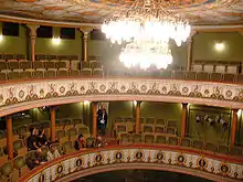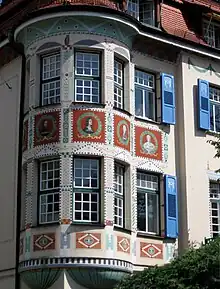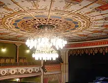 He specialised in the restoration of old paintings in theatres. For example, he restored the ceiling of the auditorium in the Nationaltheater München, the ceiling of the auditorium in the Munich Staatstheater am Gärtnerplatz (1969),[4] the Garden Hall and the "Gelbe Foyer" of the Munich Prinzregententheater (1988)[5][6][7] and the ceiling and rank draperies of the Theater Koblenz. At the Wilhelma-Theater Stuttgart, the only theatre in Germany with Pompeian decoration, he restored the balustrades and proscenium slogen in 1987. He realised the redesign from found coloured, albeit incomplete, design drawings by Ludwig von Zanth and from comparisons with related pictorial programmes.[8]