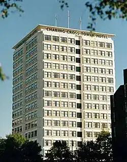 In the early 1990s, the Glasgow Development Agency had undertaken market research which showed that there would be a need for 650 budget hotel bedrooms in the city by late 1995. With this in mind, in 1994 the a lease on the building was taken by a company called Surveylink from its owner, Westmoreland Properties, to create a 270 bedroom hotel which was to be operated by the YMCA.[3] The £4.5 million refurbishment of the building was undertaken by Taylor Woodrow (Scotland) Ltd to designs of Geoffrey Reid Associates and Structural Engineers Crouch Hogg Waterman, under the supervision of Surveylink who had their offices on the top floor of the building. The hotel opened in March 1995, creating 50 jobs.[4] During the renovation, the building received a canopy on the roof, creating a covered "14th floor" to disguise the elevator penthouse.