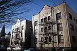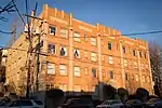 In 1928, Feig started the Architectural Services Bureau and began working as a full-time architect, although he referred to himself as a building designer. One of his first commercial clients was Harry Mittleman, who constructed several apartment buildings from designs provided by Feig, including Blackstone Apartments. Blackstone is an Egyptian Revival structure cited as a key example of Feig's work. A typical Feig design included a raised basement, three to five stories, a flat roof, and parapets raised higher at the middle and the corners.[4] Feig experimented with various revival styles where exotic motifs were applied to ordinary apartment structures, often including relief panels and cast stone decorations. The building form was also important to Feig, and he experimented with courtyards and gardens attached to U-shapes and L-shaped forms.[5]