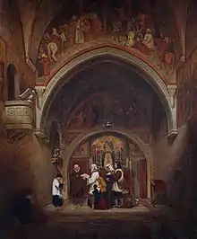 Dallas's first picture, the interior of a Roman convent, hung in the Royal Academy in 1838. In 1840 he assisted Ludwig Grüner in the decoration of the garden pavilion at Buckingham Palace, painting a series of views of Melrose, Abbotsford, Loch Awe, Aros Castle, and Windermere Lake, in illustration of the writings of Walter Scott. In 1841–2 he first exhibited in the Royal Scottish Academy. His major pictures were highly studied interiors and medieval subjects. He also painted landscapes, notably of the Campagna.[1]