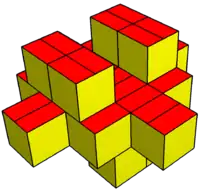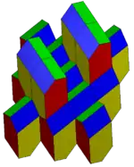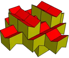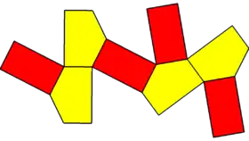 The first name is from the regular-faced gyrobifastigium but elongated with 4 triangles expanded into pentagons. The name of the gyrobifastigium comes from the Latin fastigium, meaning a sloping roof.[1] In the standard naming convention of the Johnson solids, bi- means two solids connected at their bases, and gyro- means the two halves are twisted with respect to each other. The gyrobifastigium is first in a series of gyrobicupola, so this solid can also be called an elongated digonal gyrobicupola. Geometrically it can also be constructed as the dual of a digonal gyrobianticupola. This construction is space-filling.