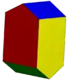 The second name, gabled rhombohedron, is from Michael Goldberg's paper on space-filling octahedra, model 8-VI, the 6th of at least 49 space-filling octahedra.[2] A gable is the triangular portion of a wall between the edges of intersecting roof pitches.