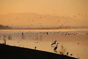 In 1972, citizens of the city voted to rename it Lake Elsinore.[21] More than a week of heavy rains in 1980 flooded the lake, destroying surrounding homes and businesses. Since then, a multimillion-dollar project has been put into place to maintain the water supply at a consistent level, allowing for homes to be built close to the lake. Overflow water in the Lake spills out via Alberhill Creek, a tributary of Temescal Creek. In 2007, an aeration system was added to help with the lake's ecosystem.