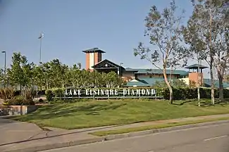 The Ballpark District takes its name from the Lake Elsinore Diamond Stadium, a first-class minor league baseball stadium constructed in 1994. It is home to the Lake Elsinore Storm professional baseball team, an affiliate of the San Diego Padres. The area was once the site of the first train depot in Lake Elsinore, but no train tracks or structures from that era remain.[27]