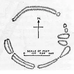 The hill fort is oval and 2.9 hectares in area.[8] It was enclosed in the 1830s and laid to pasture and last ploughed around 1943.[9] A polished stone axe was found at the site.[10]