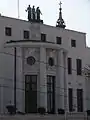 The slope of the site, on the front of two streets, where the building was constructed, represented the real challenge. The architect decided to solve this problem with the massive foundations, which work just like a fortification rather than the ground floor of a modern palace. . Thus, a kind of optical fault has been achieved in an effective way. On a geometrically simply defined object that has a ground floor, two floors and a loft, the middle zone is broken down by a centrally set semicircular shape, and trapezoidal shaped wings. This is also the most expansive zone of the building. On the second floor and attic facade, there is a pyramidal cascade and facade without any decoration, and the viewer's view would be fixed to the bronze group , where the crown dominates the vision of the palace with white facade marble. The style of the building is typical of the inter-war period, modern elements with monumental classicism and refinement of the sculptures.[7] The bronze finial group at the top of building represents Liberté, égalité, fraternité is 2.80m in height and was done by sculptor Charles Marie Louis Joseph Sarrabezolles. He was Experts' friend, known for casting concrete sculptures in innovative way, a method of direct carving in setting concrete, with much of his work was integrated with architecture. Side wings of facade have shallow reliefs that illustrate shortened history of France through Vercingetorix, Joan de Arc, Louis XIV and Marianne.[8]