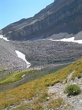 The lake is northeast of the summit of Mount Timpanogos, at the base of the almost vertical northeast face of the mountain, with an elevation of 10,397 feet (3,169 m).[1][3] The now mostly vanished and completely buried Timpanogos Glacier left behind a terminal moraine which now impounds the lake. The runoff from the rock glacier feeds the lake and colors it blue.[4] The lake is accessible by hiking, the Mount Timpanogos Trail (also known as the Aspen Grove Trail) from Aspen Grove being the fastest way to reach it. The lake is 6.9 miles (11.1 km) from the trailhead,[5] or about two-thirds of the way up to the summit.