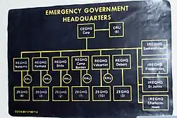 Emergency Government Headquarters is the name given for a system of nuclear fallout shelters built by the Government of Canada in the 1950s and 1960s as part of continuity of government planning at the height of the Cold War. Situated at strategic locations across the country, the largest of these shelters are popularly referred to as "Diefenbunkers", a nickname coined by federal opposition politicians during the early 1960s. The nickname was derived from the last name of the Prime Minister of the day, John Diefenbaker, who authorized their construction.[1] Over fifty facilities were built along several designs for various classes of service.